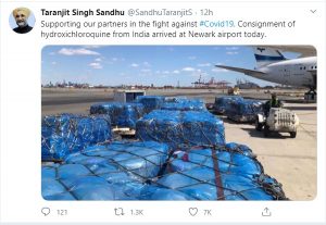 আমেরিকায় ভারতীয় দূত তরণজিত সিং সান্ধু টুইট করেন যে নেয়ার্ক বিমানবন্দরে এসেছে এই টন টন ওষুধ।