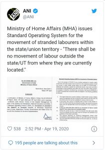 এদিন স্বরাষ্ট্রমন্ত্রক একটি অ্যাডভাইসরি জারি করে। এবং তা সমস্ত রাজ্যের কাছে পাঠিয়ে স্থানীয় প্রশাসনকে আটকে থাকা পরিযায়ী শ্রমিকদের সঙ্গে যোগাযোগ করার কথা বলা হয়। একইসাথে তাঁরা ঠিক কী ধরনের কাজ করতেন এবং কী কী কাজ করতে পারেন তার একটি তালিকা তৈরি করারও নির্দেশ দেওয়া হয়। এই তালিকা দেখেই পরিযায়ী শ্রমিকদের তাঁদের আটকে থাকা এলাকা অনুযায়ী কাজের সাথে যুক্ত করা হবে। তবে শুধু পরিযায়ী শ্রমিকেরাই নয়, কেন্দ্রের এই সিদ্ধান্তের ফলে ১০০ দিনের কাজ থেকে শুরু করে ইটভাটা মালিক ও কৃষকেরাও উপকৃত হবেন বলে আশা করা হচ্ছে।