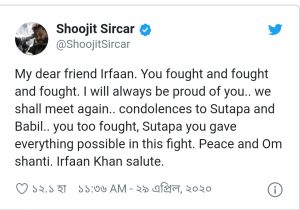 নিউজটাইম ওয়েবডেস্ক : প্রয়াত বলিউড অভিনেতা ইরফান খান। বুধবার সকালে মুম্বইয়ের একটি হাসপাতালে শেষ নিঃশ্বাস ত্যাগ করেন অভিনেতা। মৃত্যুকালে তাঁর বয়স হয়েছিল ৫৪ বছর। ইতিমধ্যেই ইরফান খানের মৃত্যুর খবর নিশ্চিত করে একটি ট্যুইট করেন পরিচালক সুজিত সরকার।