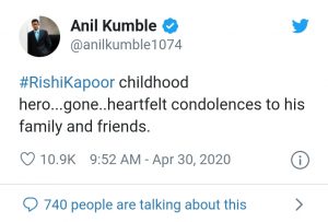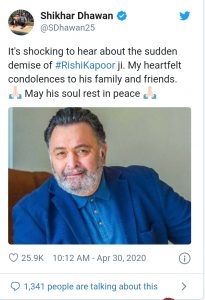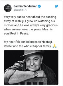 বলিউড অভিনেতার এই অকাল প্রয়ানে শোক প্রকাশ করে ক্রিকেট ঈশ্বর শচীন তেণ্ডুলকর বলেন, “ঋষিজির মৃত্যু সংবাদ শুনে আমি অত্যন্ত ব্যথিত। ওনার সিনেমা দেখেই আমরা বড় হয়েছি। যতবার আমাদের দেখা হয়েছে ততবারই ওনার থেকে আন্তরিকতা পেয়েছি। ওনার আত্মার শান্তি কামনা করি। নীতুজি এবং রণবীর-সহ পুরো পরিবারের প্রতি সমবেদনা জানাই।”