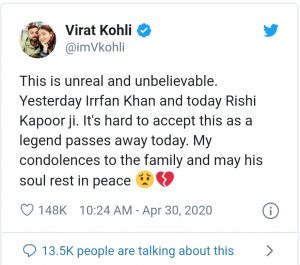 ভারতীয় দলের অধিনায়ক বিরাট কোহলি ট্যুইটে লেখেন, “এটা অবিশ্বাস্য, অবাস্তব। গতকাল ইরফান খান আর আজ ঋষিজি! আজ একজন কিংবদন্তির প্রয়াণ হল। এটা মেনে নিতে পারছি না। ওঁর আত্মার শান্তি কামনা করি। পরিবারের প্রতি সমবেদনা রইল।”