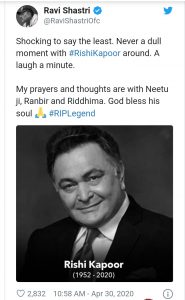 বিশিষ্ট এই অভিনেতার মৃত্যুতে শোক জ্ঞাপন করে টিম ইন্ডিয়ার কোচ রবি শাস্ত্রী টুইটে লেখেন, “ওঁর মৃত্যু সংবাদ শুনে বিস্মিত হয়েছে। ওঁর সাথে থাকলে খুব হাসিখুশিতেই সময় কাটত। নীতুজি, রণবীর এবং ঋদ্ধিমার প্রতি আমার সমবেদনা। ঈশ্বর কাছে ওঁর আত্মাকে শান্তি কামনা করি।”