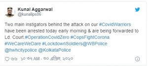 বৃহস্পতিবার সকালে একটি টুইটবার্তায় হাওড়া পুলিশের কমিশনার কুণাল আগরওয়াল বলেন, করোনা যোদ্ধাদের উপর হামলার ঘটনায় জড়িত দুই মূল প্ররোচককে আজ ভোরের দিকে গ্রেফতার করা হয়েছে। তাঁদের আদালতে ফরোয়ার্ড করা হবে বলে জানানো হয়।