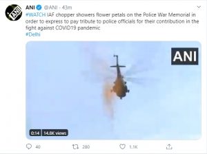 নিউজটাইম ওয়েবডেস্ক : করোনার প্রকোপে নাজেহাল গোটা বিশ্ব, গোটা দেশ ৷ করোনা মোকাবিলায় দেশ জুড়ে এখনও লকডাউন অব্যাহত ৷ করোনা থেকে মুক্তি পেতে দেশের জরুরী পরিষেবার সঙ্গে যুক্ত মানুষেরা দিন-রাত এক করে দিচ্ছেন ৷ সেই মানুষদের সম্মান জানাতেই এবার এগিয়ে এল দেশের বিমান বাহিনী ও নৌসেনারা ৷