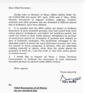 গত সপ্তাহে ভিডিয়ো কনফারেন্সে ক্যাবিনেট সচিব রাজীব গৌবাও স্পষ্ট জানিয়েছিলেন যে, লকডাউনে পরিবহণে ছাড় দেওয়া হচ্ছে শুধুমাত্র বিচ্ছিন্ন ও নিরুপায়দের কথা ভেবেই। এই তালিকায় ভিনরাজ্যে থেকে যাওয়া মানুষের সুবিধা মিলবে না।