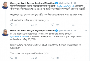 বৃহস্পতিবার বিকেল সাড়ে চারটে নাগাদ ট্যুইট করেন রাজ্যপাল। তিনি লেখেন, গত ৬ই মে যে নির্দেশিকা জারি হয়, সে ব্যাপারে তাকে অবগত না করার কারণ কী জানতে চেয়ে মুখ্য সচিবকে চিঠি দিলেও, তার কোনো উত্তর পাননি তিনি। তিনি এও লেখেন, ভারতীয় সংবিধানেক অনুচ্ছেদ ১৬৭ অনুযায়ী, রাজ্যপালকে তথ্য সরবরাহ করা মুখ্যমন্ত্রী কর্তব্য। এবং এর গভীর তাৎপর্যও আছে।