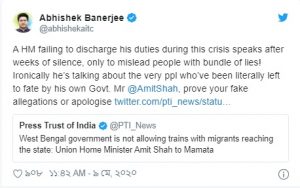 কেন্দ্রীয় স্বরাষ্ট্রমন্ত্রী “ঝুড়ি ঝুড়ি মিথ্যে অভিযোগ” করেছেন বলে পাল্টা অভিযোগ করেন ওই তৃণমূল সাংসদ। মুখ্যমন্ত্রীর ভাইপো বলেন, কেন্দ্রের কারণেই এই দুর্ভোগ পোহাতে হচ্ছে পরিযায়ী শ্রমিকদের। এতদিন তাঁদের ভাগ্য়ের হাতে ফেলে রেখেছিল কেন্দ্র, এখন তারা কথা বলছে। “এই সঙ্কটের সময়ে কেন্দ্রীয় স্বরাষ্ট্রমন্ত্রক নিজের দায়িত্ব পালনে পুরোপুরি ব্যর্থ। এতদিন চুপচাপ থেকে এবার একগাদা মিথ্যা বলে মানুষকে বিভ্রান্ত করছেন তিনি!”, এই অভিযোগই করেন অভিষেক গঙ্গোপাধ্যায়। তিনি টুইটে লেখেন,”এতদিন এই মানুষদেরই আক্ষরিক অর্থে তাঁদের নিজেদের ভাগ্যের হাতে ফেলে রেখেছিল সরকার। শ্রী অমিতশাহ, আপনি আপনার অভিযোগ প্রমাণ করুন অথবা ক্ষমা চান”।