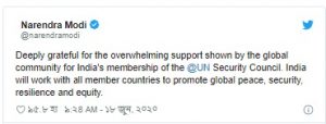 বৃহস্পতিবার প্রধানমন্ত্রী নরেন্দ্র মোদী টুইটে বলেন, “রাষ্ট্রপুঞ্জের সদস্যপদের জন্য বিশ্বের এই সমর্থনের জন্য গভীরভাবে কৃতজ্ঞ আমরা। নিরাপত্তা পরিষদে অন্যান্য দেশগুলির সঙ্গে ভারত বিশ্বব্যাপী শান্তি, সুরক্ষা ও নিরাপত্তার বিষয়ে কাজ করে যাবে।”