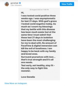 নিজের ইনস্টার দেওয়ালে অভিনেত্রী জানিয়েছেন ২১ দিন আগে তাঁর রিপোর্ট পজিটিভ আসায় আইসোলেশনে যেতে বাধ্য হন তিনি । একাকীত্বের ভয়াবহতা খুব ভালো ভাবেই টের পেয়েছেন ‘ফোর্স’ নায়িকা, সেই অভিজ্ঞতাই অনুরাগীদের সঙ্গে শেয়ার করে নিলেন জেনেলিয়া । ‘ কোনও গ্যাজেট , ইন্টারনেট, ডিজিটাল দুনিয়া বা কোনো বিকল্পই কোনোদিন মানুষের একাকীত্বের যন্ত্রনাকে ভুলিয়ে দিতে পারেনা ‘ । আপাতত নিজের পরিবার-পরিজন , স্বামী রীতেশ ও দুই সন্তান রাহিল এবং রিহানের সাথে একাত্ম্য হতে পেরে স্বস্তির নিঃশ্বাস ফেলছেন অভিনেত্রী । উপসর্গ থাকুক বা না থাকুক টেস্ট করানো , সুস্থ থাকা এবং অস্বাস্থ্যকর খাবার এড়িয়ে চলাই এই রোগের সাথে লড়াইয়ের মূল অস্ত্র বলে মনে করেন জেনেলিয়া ।