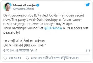 এর পরই হিন্দিতে দুই লাইনের একটি প্রতিবাদী–ছড়া লিখেছেন মুখ্যমন্ত্রী মমতা বন্দ্যোপাধ্যায়। তিনি সেখানে লিখেছেন, ‘দলিতদের যারা সর্বনাশ করছে, সেই বিজেপি ধ্বংস হয়ে যাবে।’