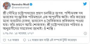 টুইটারে বাংলা, হিন্দি ও ইংরেজি- মোটি ৩টি ভাষায় শোকবার্তা জানিয়েছেন প্রধানমন্ত্রী। “শ্রী সৌমিত্র চট্টোপাধায়ের প্রয়াণ চলচ্চিত্র জগৎ, পশ্চিমবঙ্গ-সহ ভারতের সাংস্কৃতিক পরিমন্ডলে এক অপূরণীয় ক্ষতি। তাঁর কাজের মধ্যে বাঙালির চেতনা, ভাবাবেগ ও নৈতিকতার প্রতিফলন পাওয়া যায়। তাঁর প্রয়াণে আমি শোকাহত। শ্রী চট্টোপাধ্যায়ের পরিবার ও অনুরাগীদের সমবেদনা জানাই। ওঁ শান্তি”, টুইট করলেন মোদী।